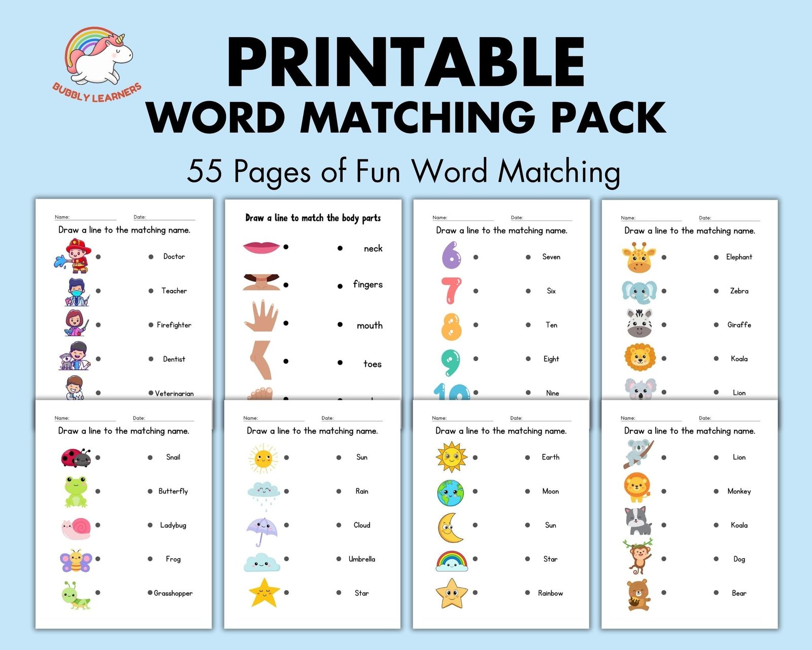Spark your child’s learning journey with our engaging printable worksheets designed to connect images to their corresponding words. This pack includes 55 pages featuring colorful illustrations of variety of topics such as professions, emotions, animals, colors, weather, fruits and vehicles. Perfect for enhancing vocabulary and cognitive skills in young learners.