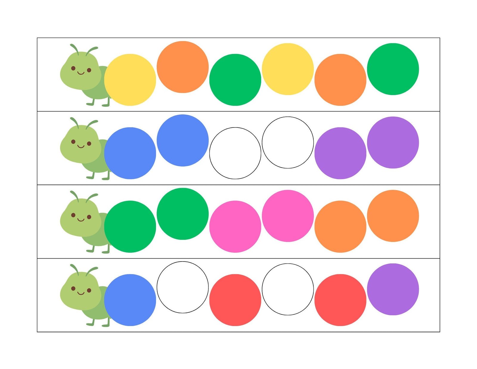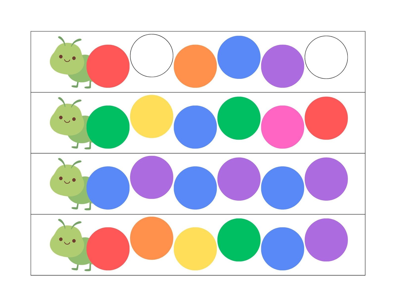 15 Pages of printable caterpillar pompom pattern worksheets for toddlers, kindergarteners, kids, preschoolers. There are 4 strips per pages, totalling of 60 different pattern strips. You may use 1 inch pompoms for this. We use white, red, pink, orange, yellow, green, blue and purple.