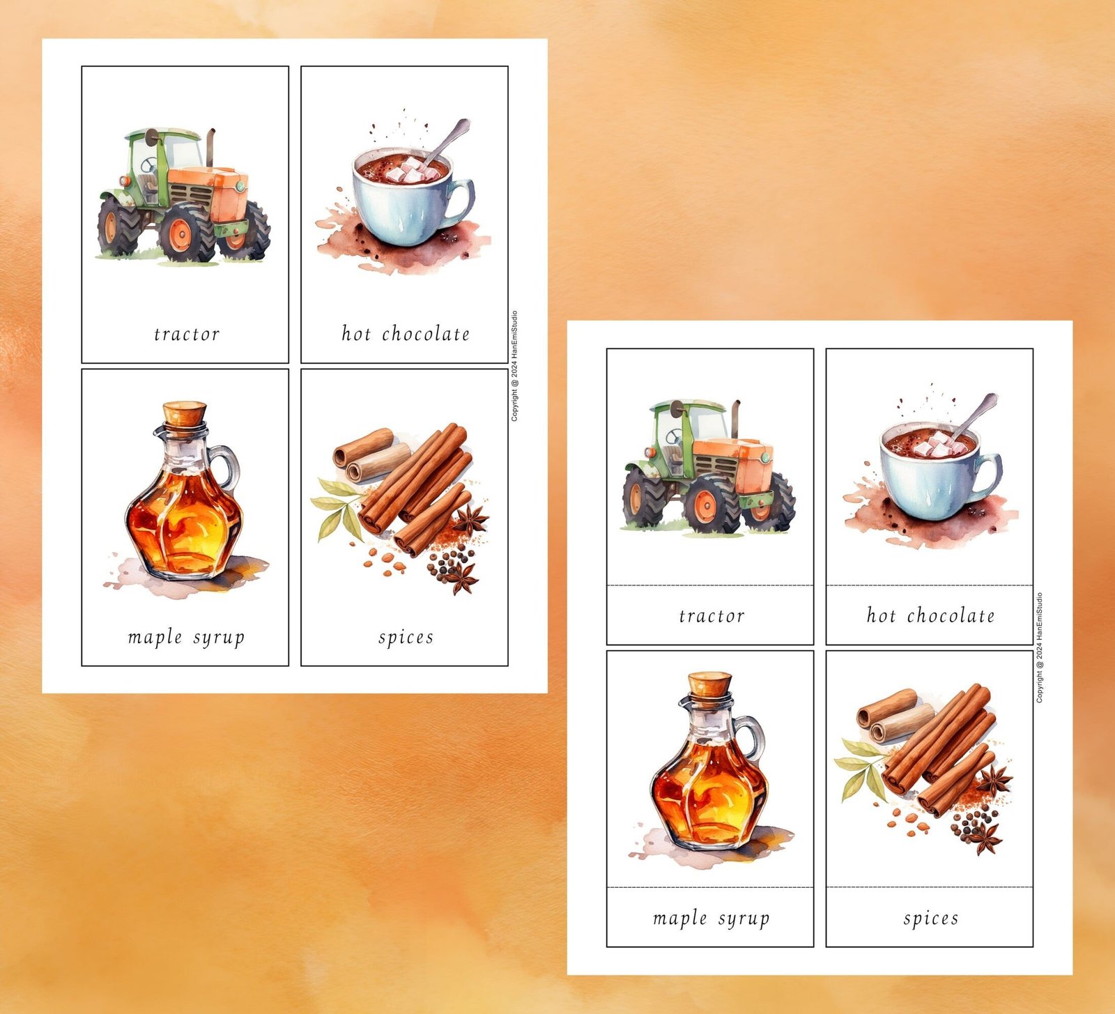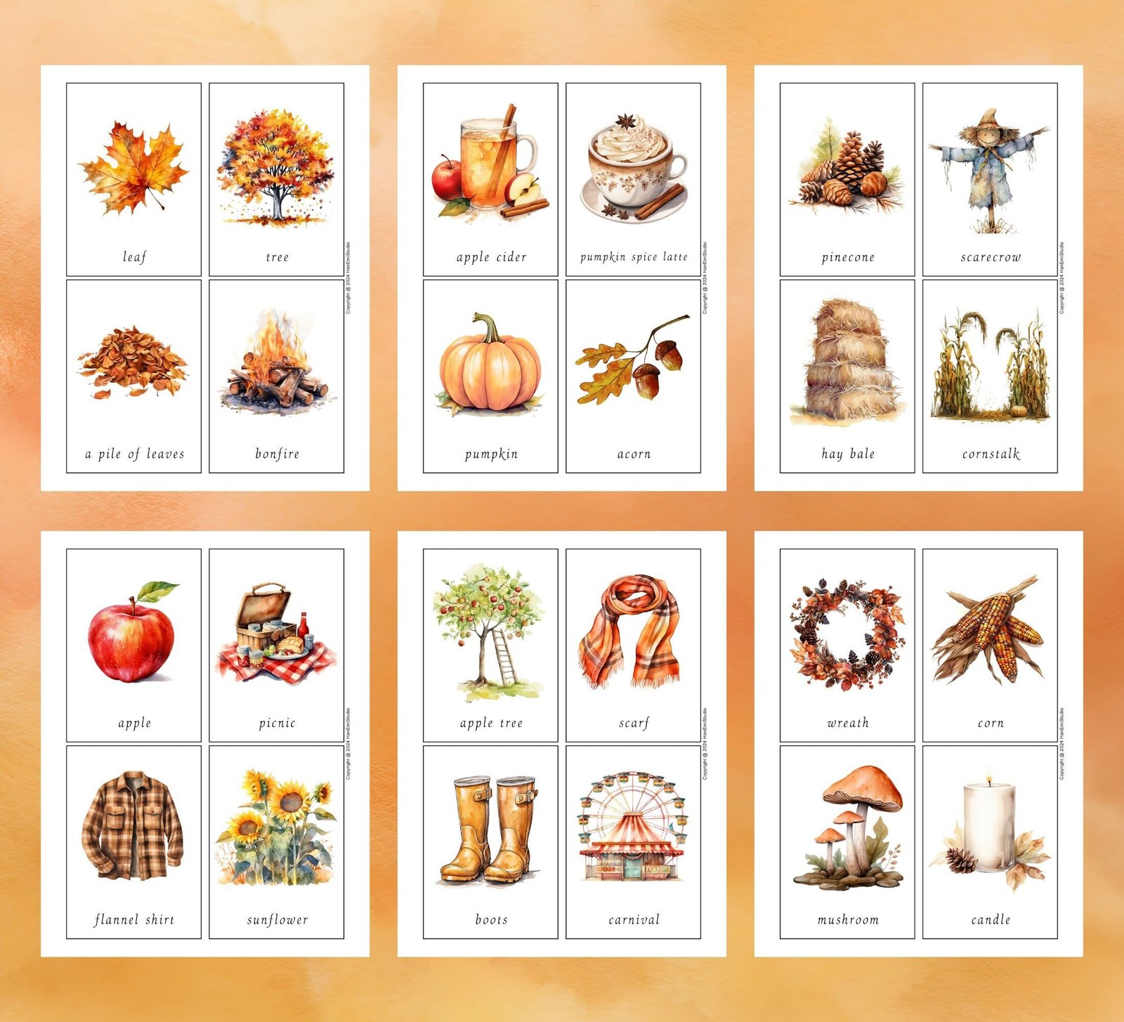 60 Watercolor Fall Vocabulary Flashcards for kids; Kids Flashcards; Autumn Flashcards; Montessori Flashcards; Printable Flashcards