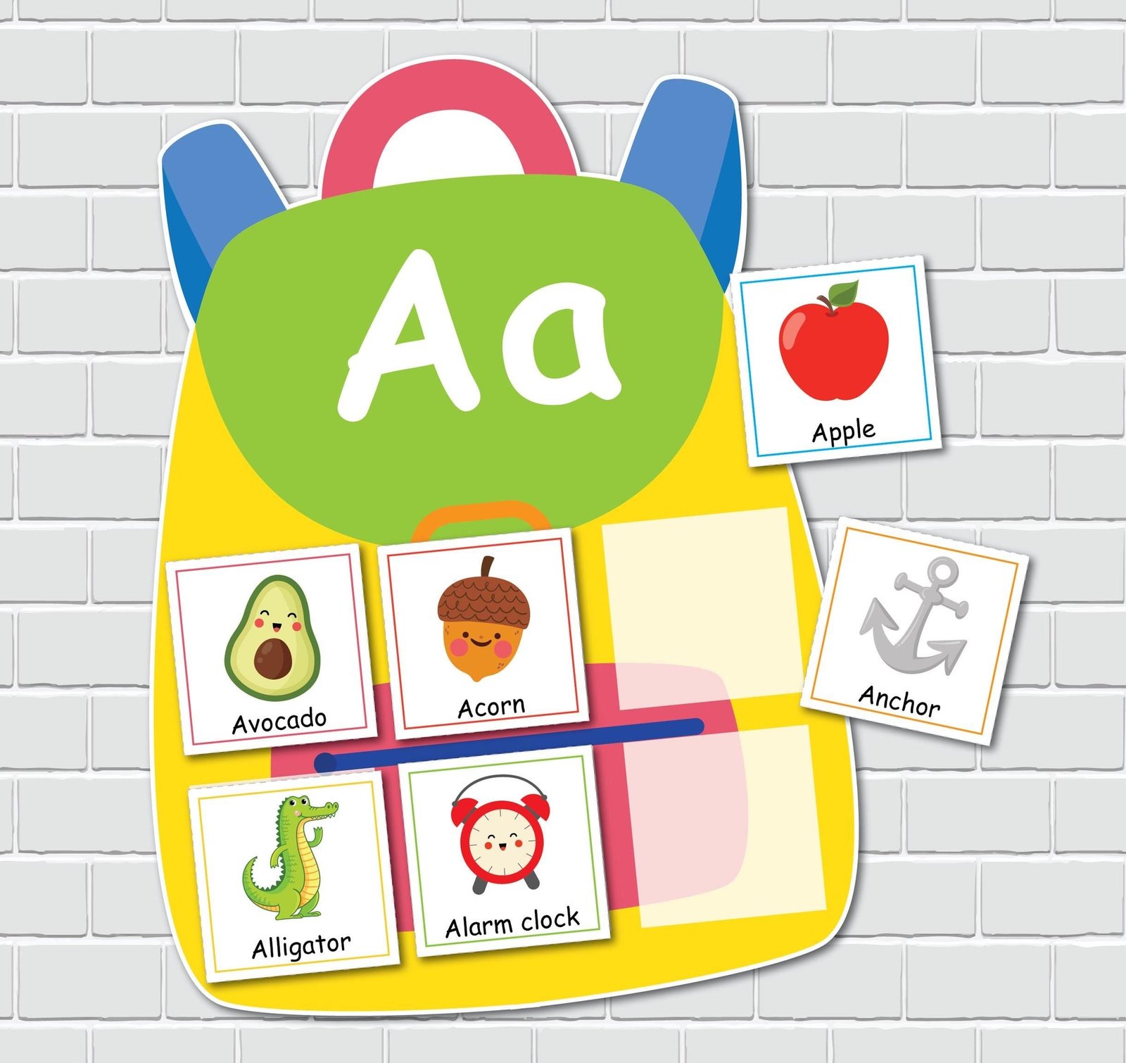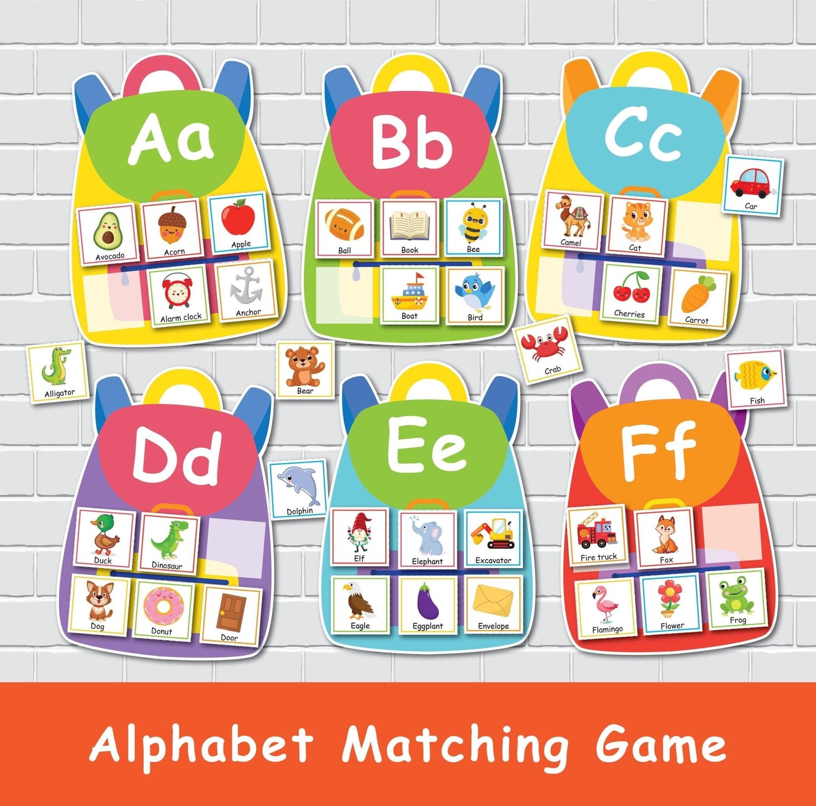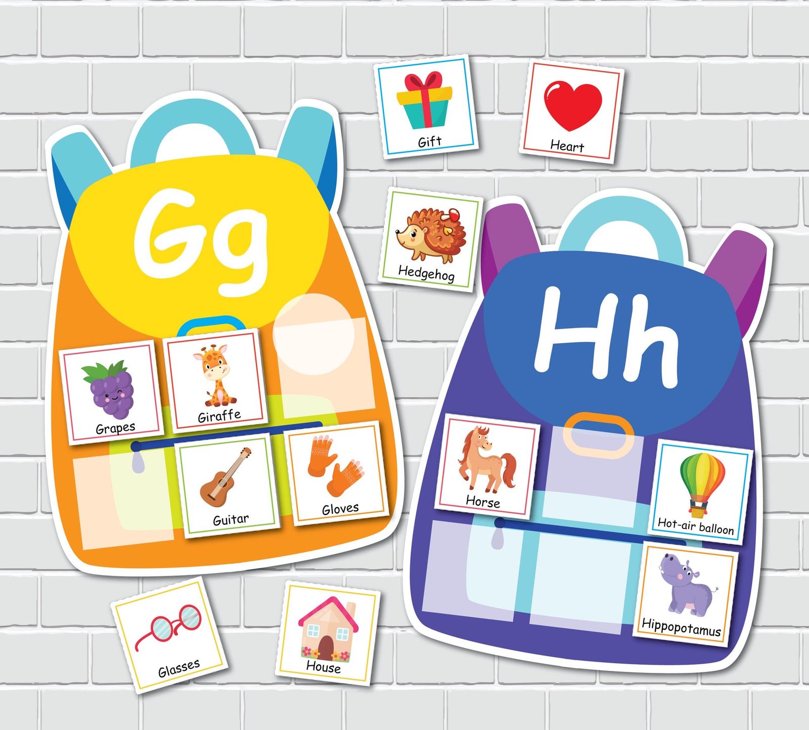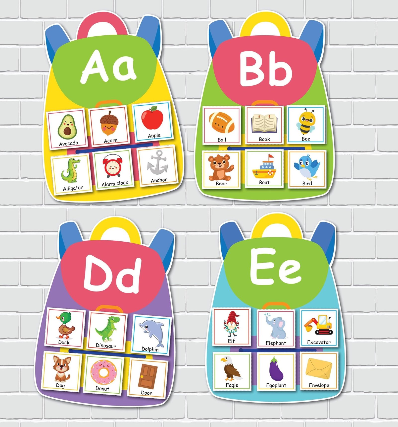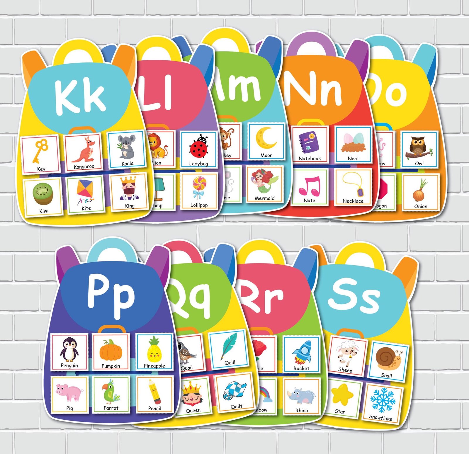 -13 pages featuring colorful backpacks with letters, with 2 backpacks per page