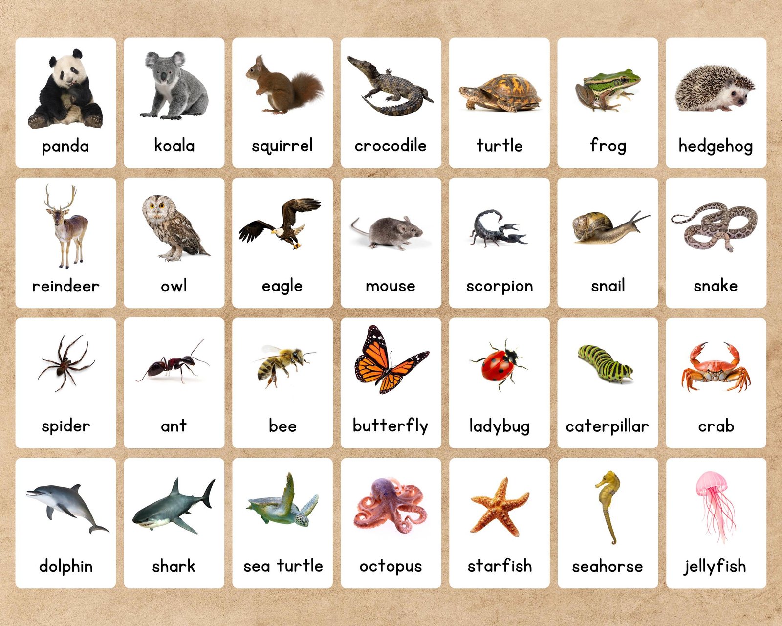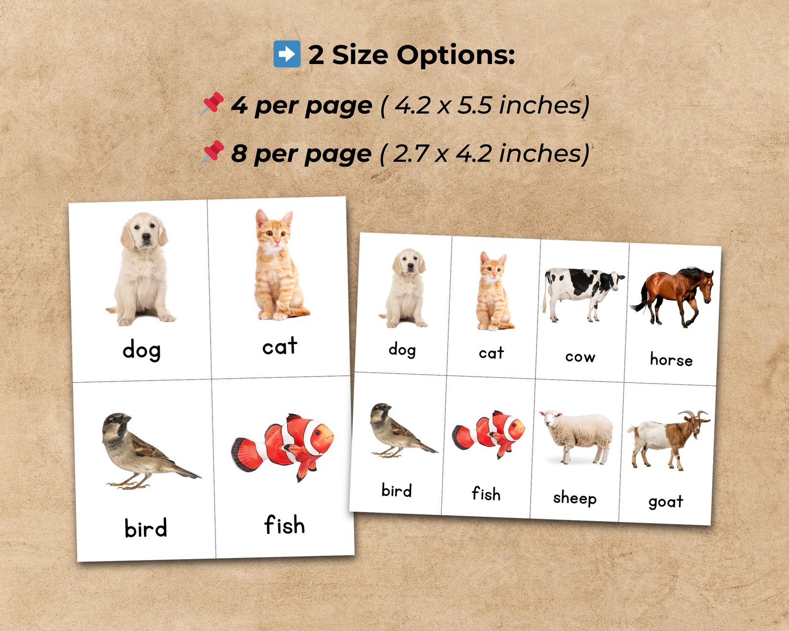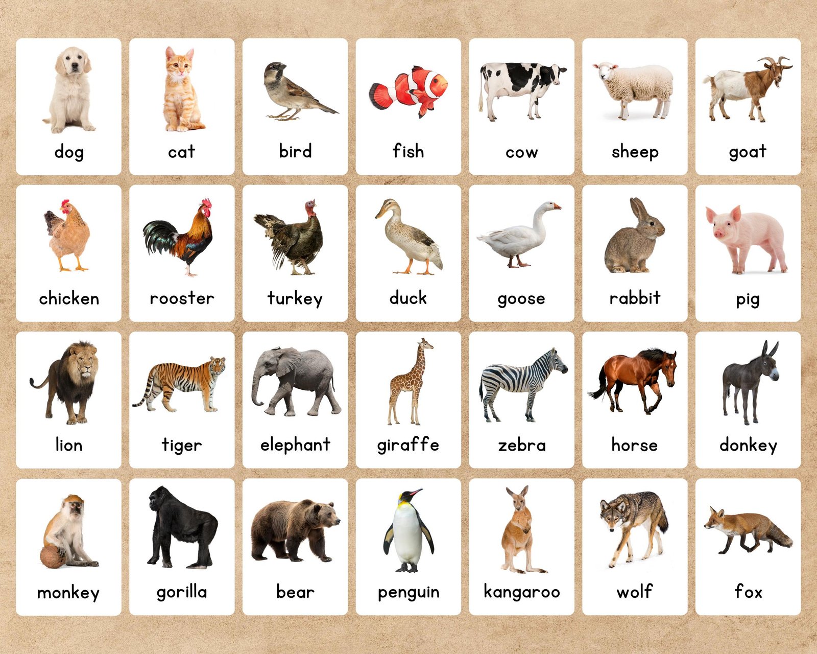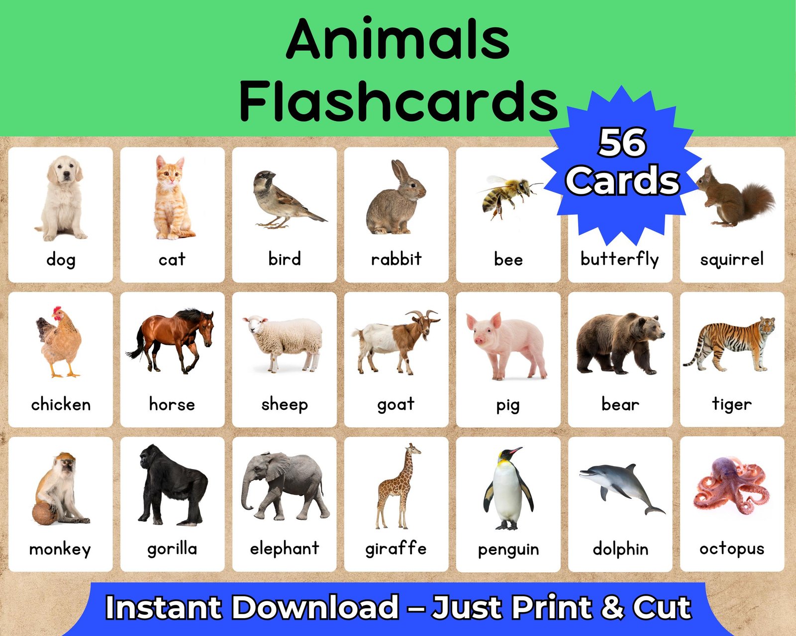 Animal Flashcards for Kids | 56 Printable Cards | Preschool, Kindergarten, ESL, Homeschool | Learn Animals Names Game & Activity | Printable