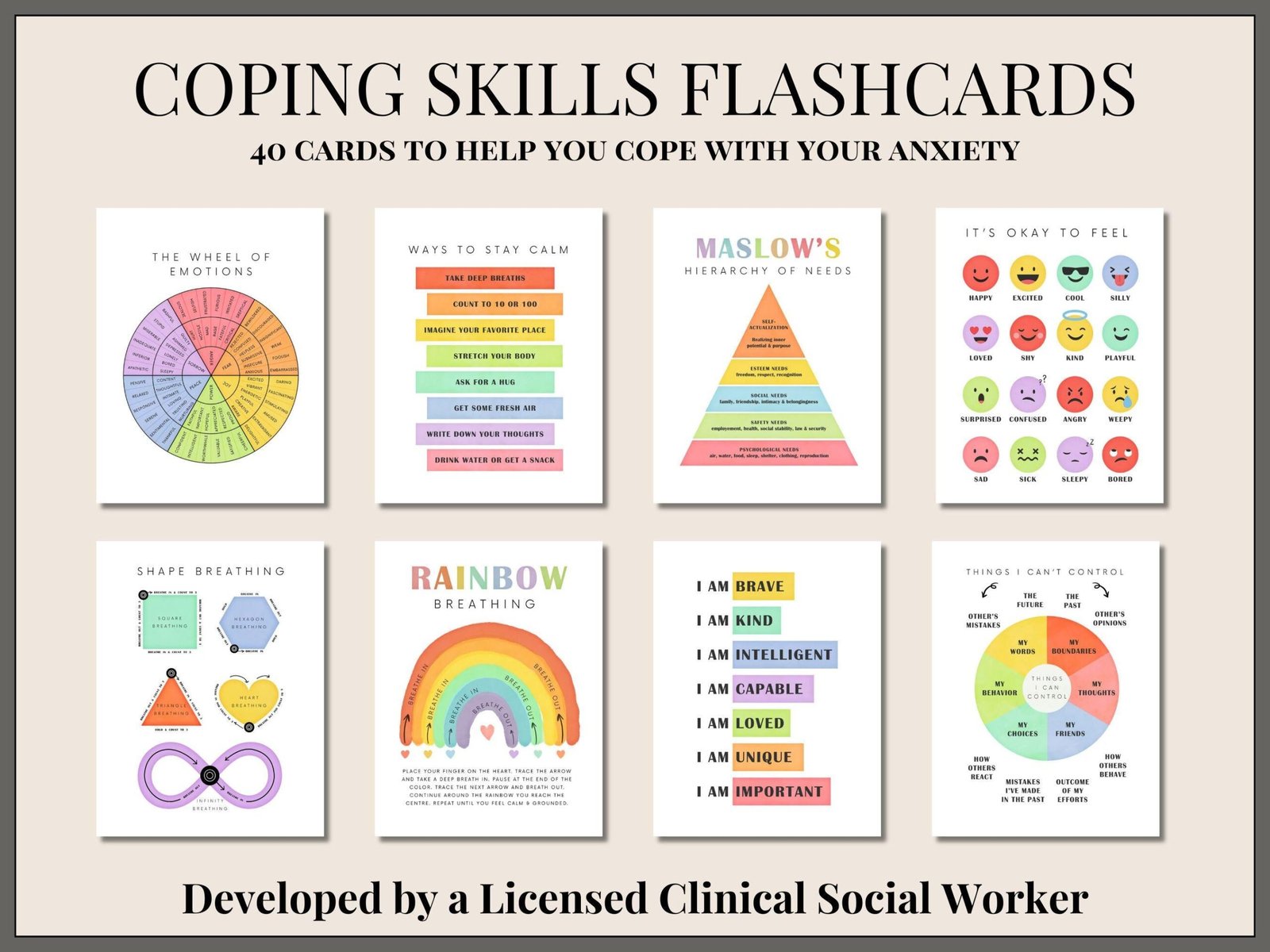 Anxiety Coping Skills Flashcards Workbook Digital or Printable Worksheets for Worry Stress Panic, Self-Help Anxiety Worksheets,Therapy tools