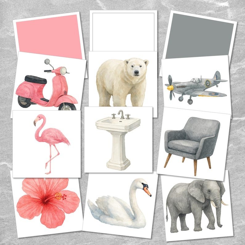 – 28 pages of object cards (14 colors x 2), each with 6 objects