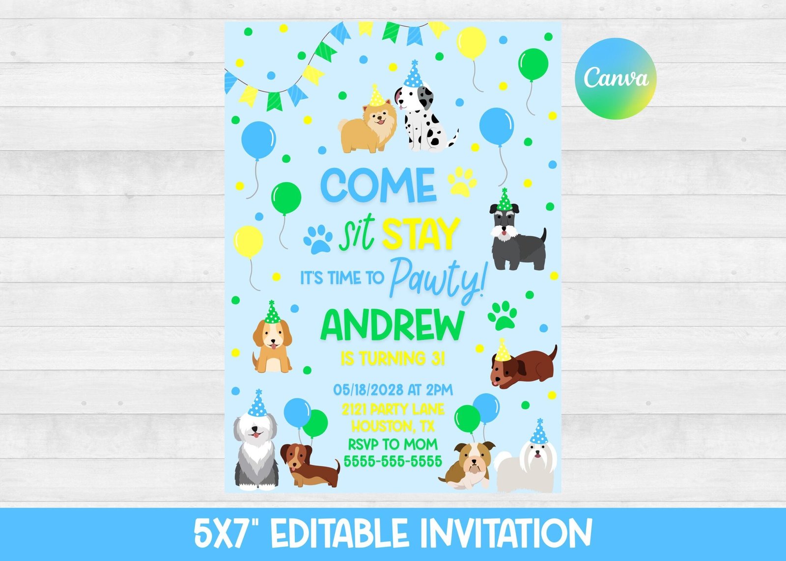 DETAILS: This super cute invite measures 5×7 inches. All text, background, and colors are editable! Images are not editable but are movable and removable.