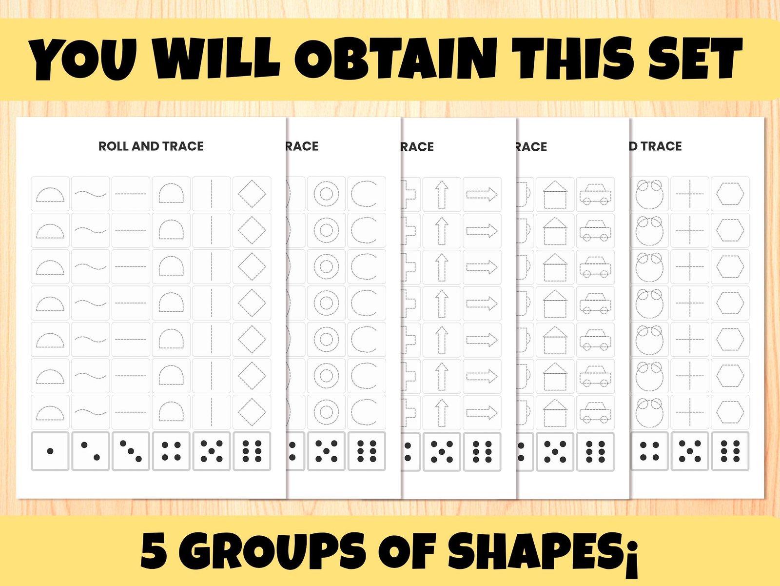 5 Different Shape/Pre-writing Stroke Groups: Keeps the tracing practice varied (e.g., lines, curves, basic shapes, picture outlines).