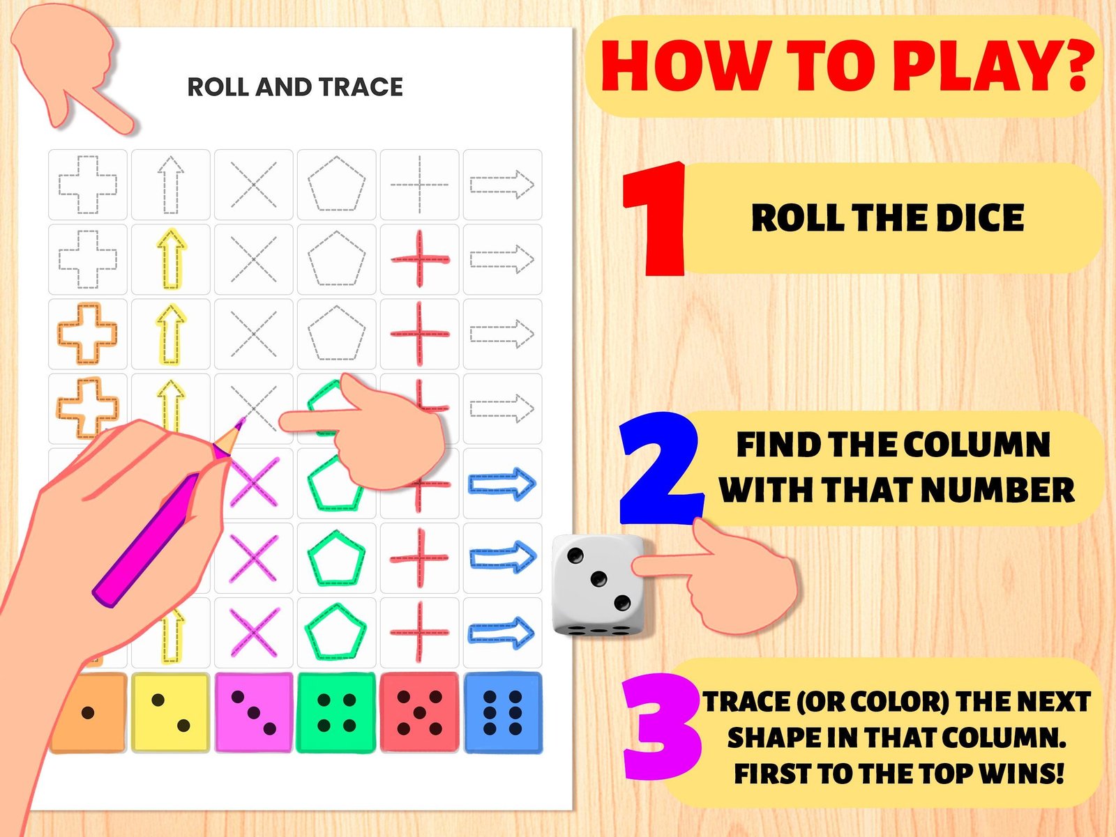 Kids roll a standard die, identify the number, find the matching column on their game board, and trace the next shape in that column. The first player to trace all the shapes in any one column and reach the top is the winner! It’s fantastic for individual practice or friendly competition.