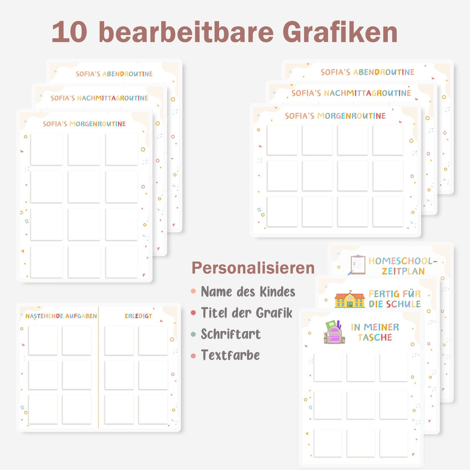 Plan your child’s day with our Editable Daily Routine Cards. This versatile Routine Chart combines Montessori principles and visual schedules to create an engaging and efficient daily rhythm, complete with chore checklists, morning, afternoon and evening routine charts for kids, toddlers and preschoolers. The ultimate must-have tool for moms, teachers, and caregivers!