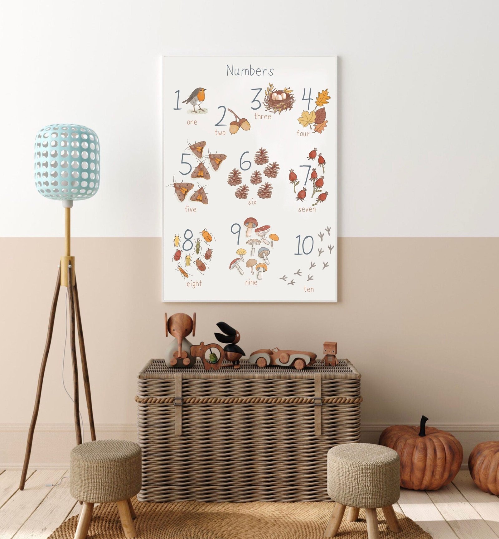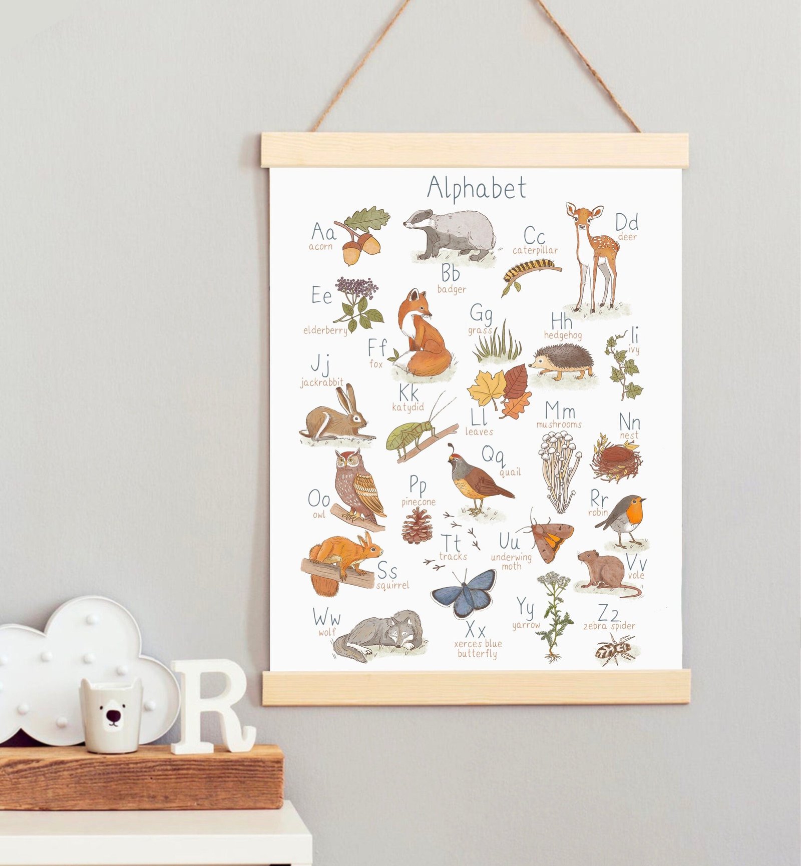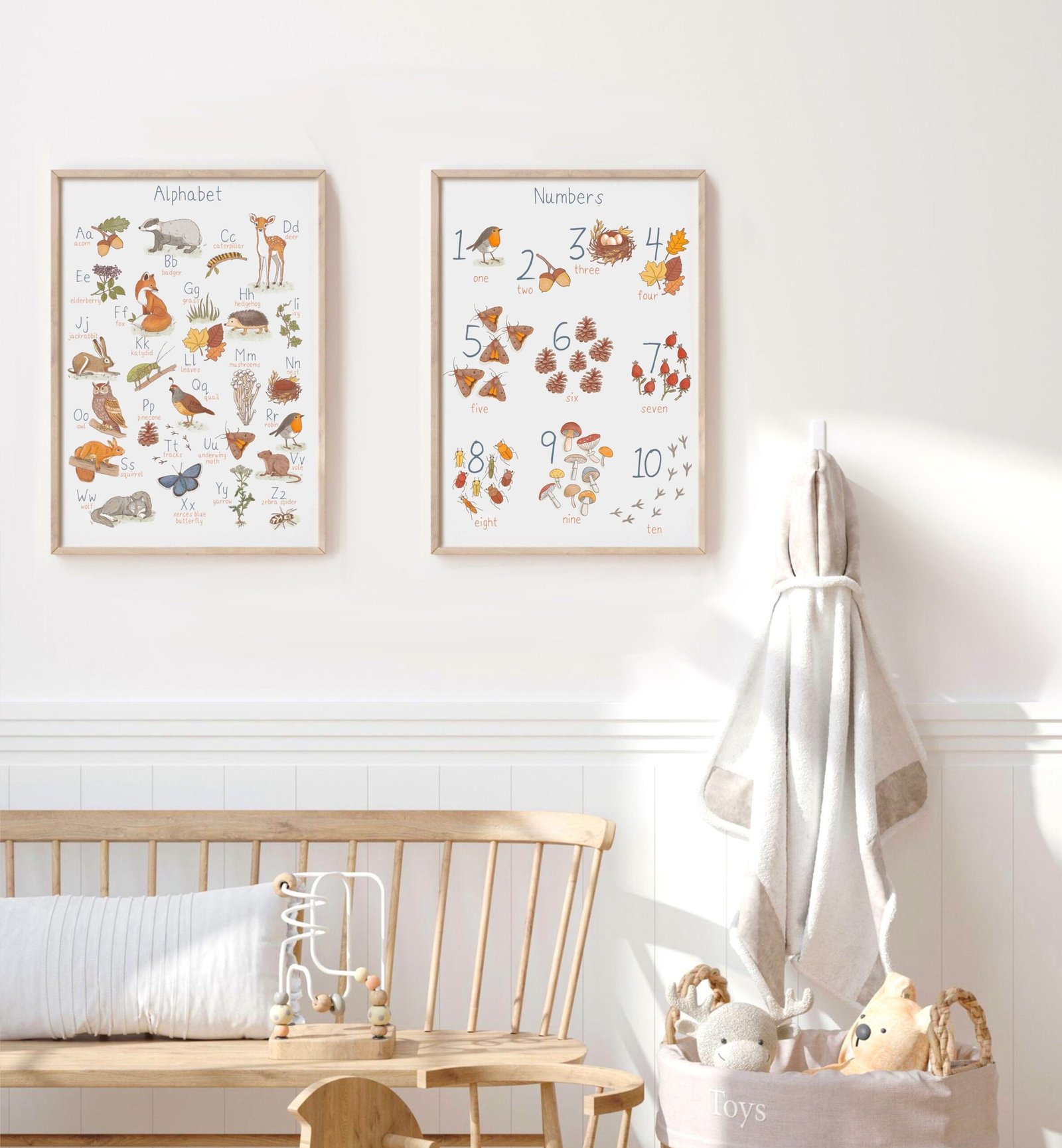 Set of two educational posters, Woodland Alphabet Poster and Woodland Numbers Poster.