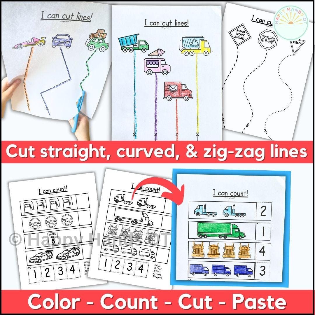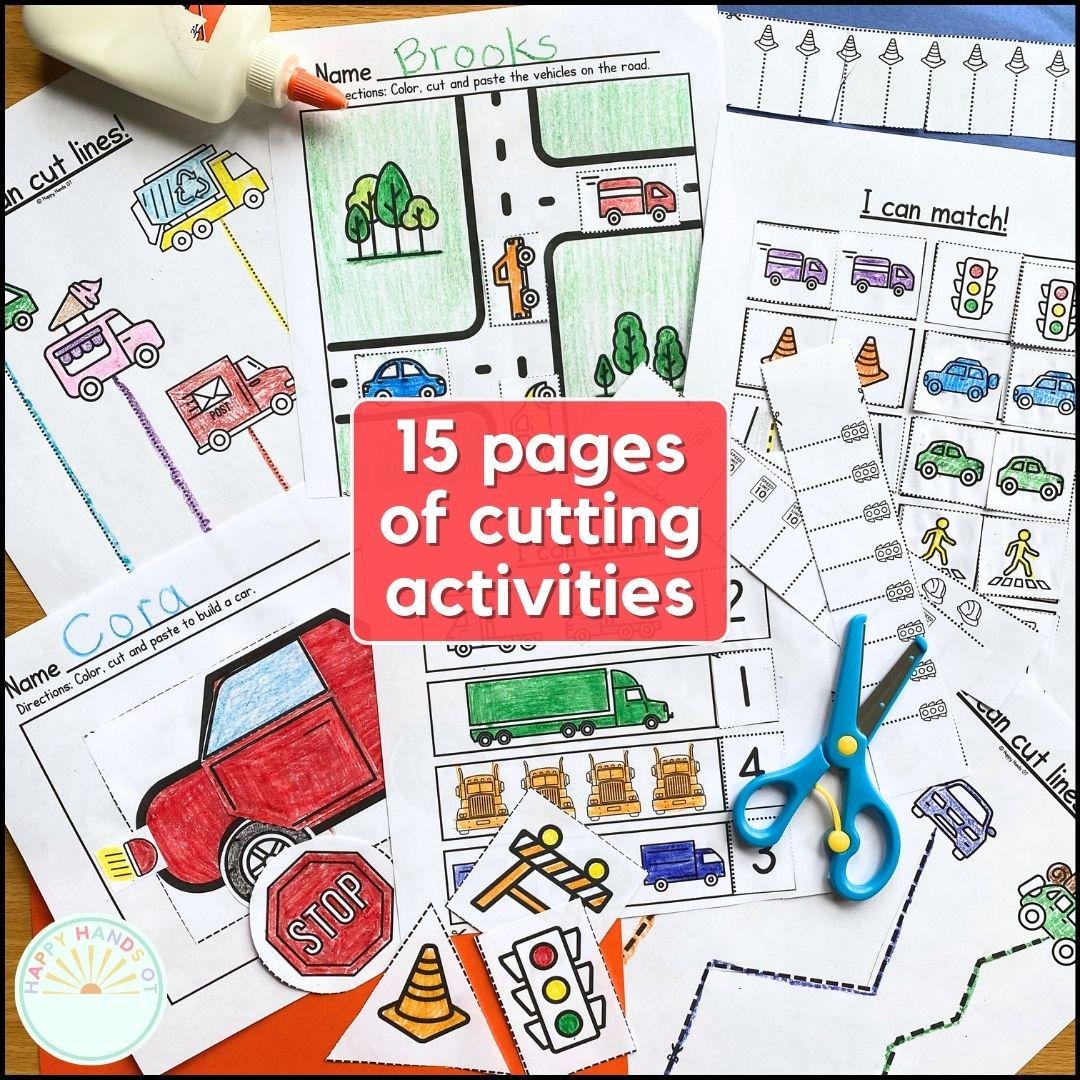 Build scissor skills with this transportation preschool cutting practice printable! Perfect for car & truck loving kids, occupational therapy sessions, and fine motor skills development at home. This NO-PREP set of worksheets is packed with cutting practice that includes snipping and line cutting, 2D shape cutting, cut and paste counting worksheets, a matching activity, and craft activities.
